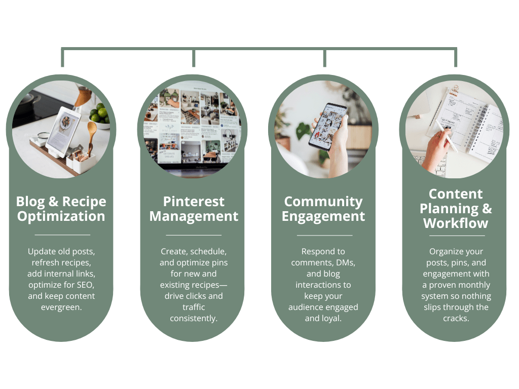 My goal is simple: to take content off your plate so you can focus on creating recipes, connecting with your audience, and growing your business without burnout.